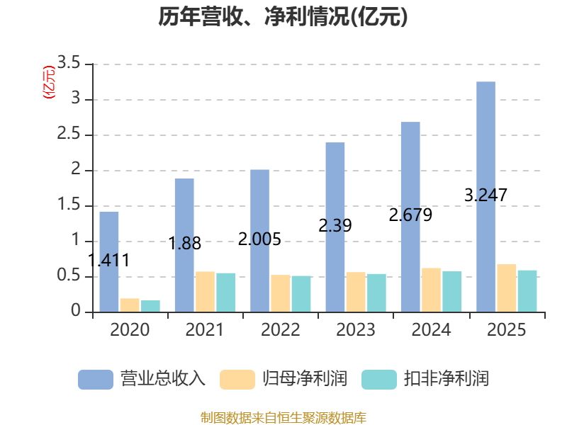 中证智能财讯国子软件(920953)4月21日披露2025年年度报告。2025年,公司实现营业总收入3.25亿元,同比增长21.19%;归母净利润6704.69万元,同比增长9.10%;扣非净利润5827.07万元,同比增长2.23%;经营活动产生的现金流量净额为50.51万元,同比下降95.99%;报告期内,国子软件基本每股收益为0.52元,加权平均净资产收益率为11.69%。公司2025年度分配预案为:拟向全体股东每10股派现1.28元(含税)。