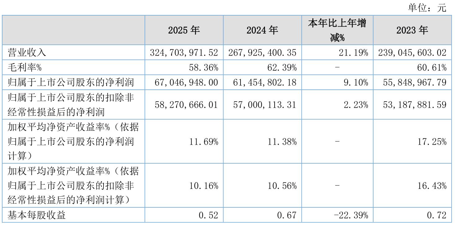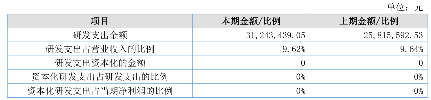 2025年全年,公司研发投入金额为3124.34万元,同比增长21.03%;研发投入占营业收入比例为9.62%,相比上年同期下降0.02个百分点。此外,公司全年研发投入资本化率为0%。
