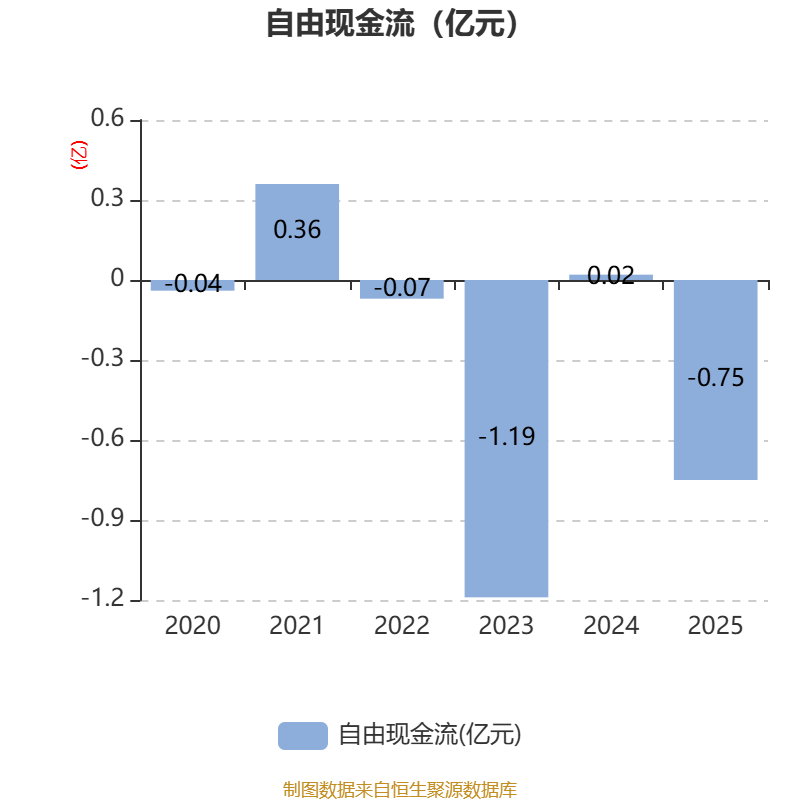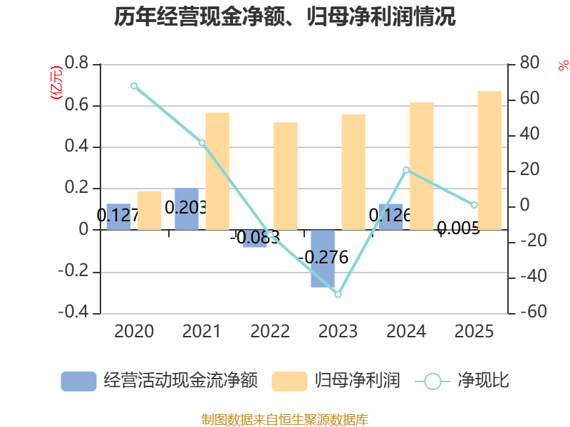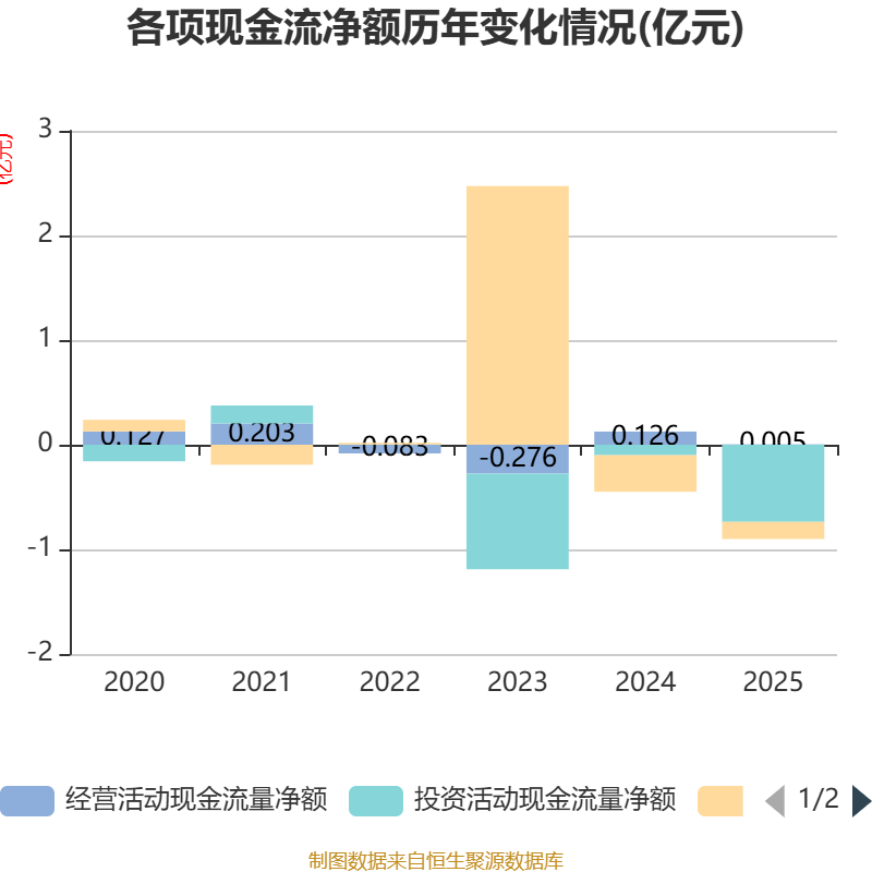 截至2025年,公司经营活动现金流净额为50.51万元,同比下降95.99%;筹资活动现金流净额-1638.71万元,同比增加1849.19万元;投资活动现金流净额-7366.71万元,上年同期为-1002.97万元。