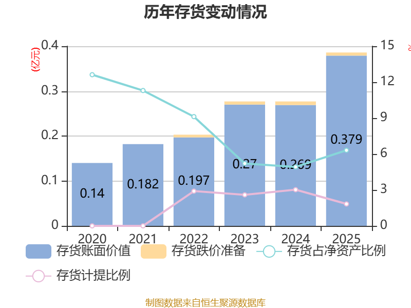 从存货变动来看,截至2025年末,公司存货账面价值为3794.74万元,占净资产的6.31%,较上年末增加1106.85万元。其中,存货跌价准备为70.62万元,计提比例为1.83%。