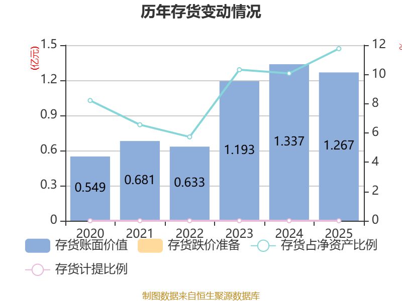从存货变动来看,截至2025年末,公司存货账面价值为1.27亿元,占净资产的11.76%,较上年末减少707.24万元。公司本期没有计提存货跌价准备。