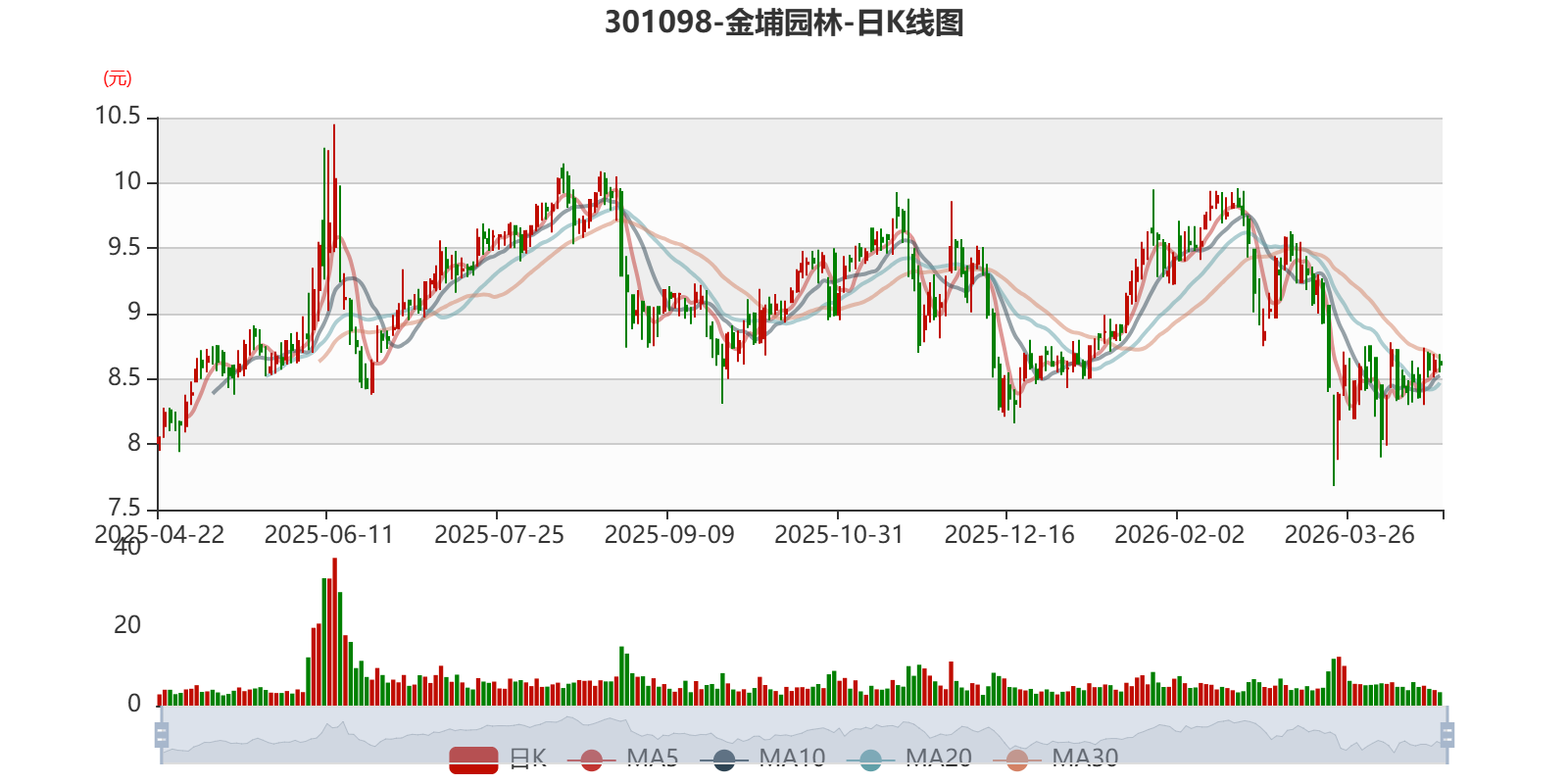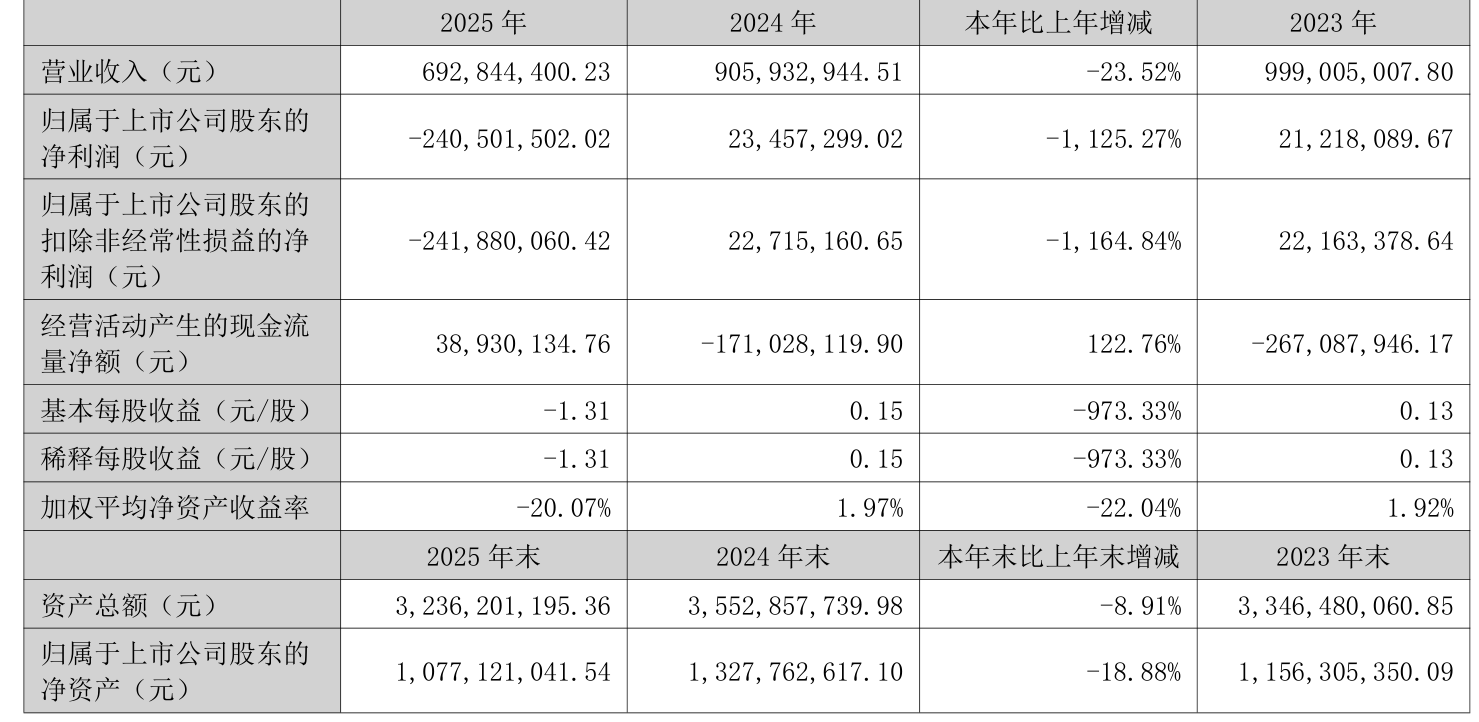 中证智能财讯金埔园林(301098)4月22日披露2025年年度报告。2025年,公司实现营业总收入6.93亿元,同比下降23.52%;归母净利润亏损2.41亿元,上年同期盈利2345.73万元;扣非净利润亏损2.42亿元,上年同期盈利2271.52万元;经营活动产生的现金流量净额为3893.01万元,上年同期为-1.71亿元;报告期内,金埔园林基本每股收益为-1.31元,加权平均净资产收益率为-20.07%。
