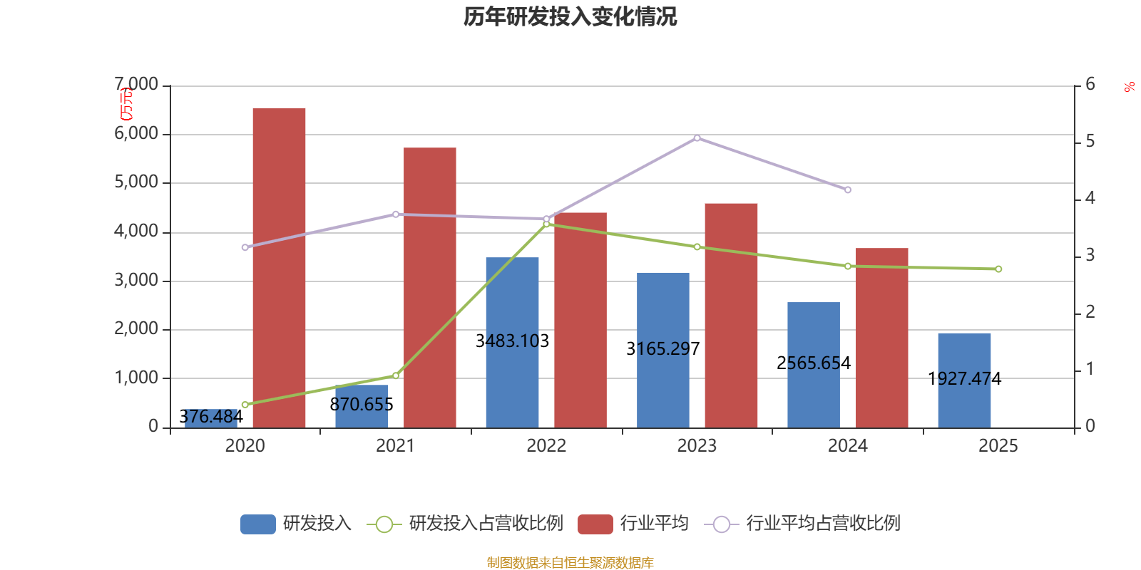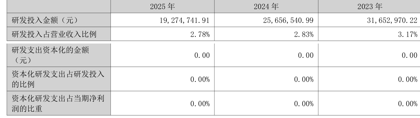 2025年全年,公司研发投入金额为1927.47万元,同比下降24.87%;研发投入占营业收入比例为2.78%,相比上年同期下降0.05个百分点。此外,公司全年研发投入资本化率为0%。