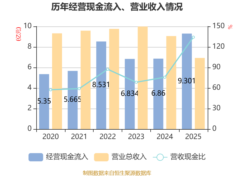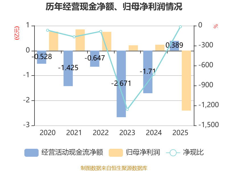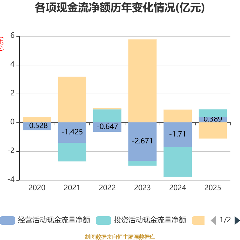 截至2025年,公司经营活动现金流净额为3893.01万元,同比增加2.1亿元;筹资活动现金流净额-1.12亿元,同比减少2.01亿元;投资活动现金流净额5186.89万元,上年同期为-2.06亿元。
