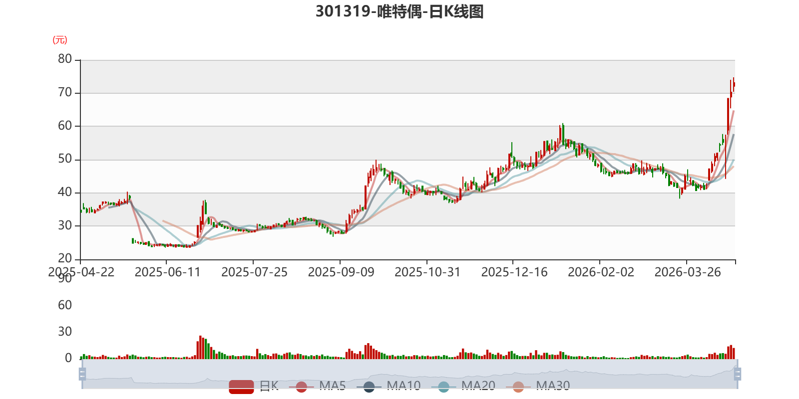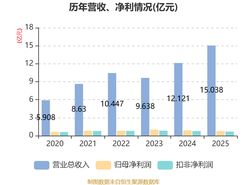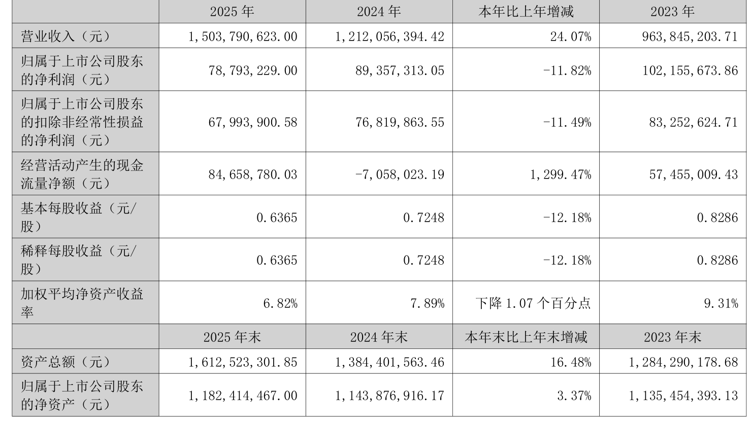 中证智能财讯唯特偶(301319)4月22日披露2025年年度报告。2025年,公司实现营业总收入15.04亿元,同比增长24.07%;归母净利润7879.32万元,同比下降11.82%;扣非净利润6799.39万元,同比下降11.49%;经营活动产生的现金流量净额为8465.88万元,上年同期为-705.8万元;报告期内,唯特偶基本每股收益为0.6365元,加权平均净资产收益率为6.82%。公司2025年度分配预案为:拟向全体股东每10股转4.5股,派现5元(含税)。
