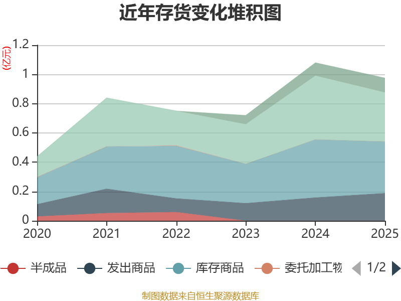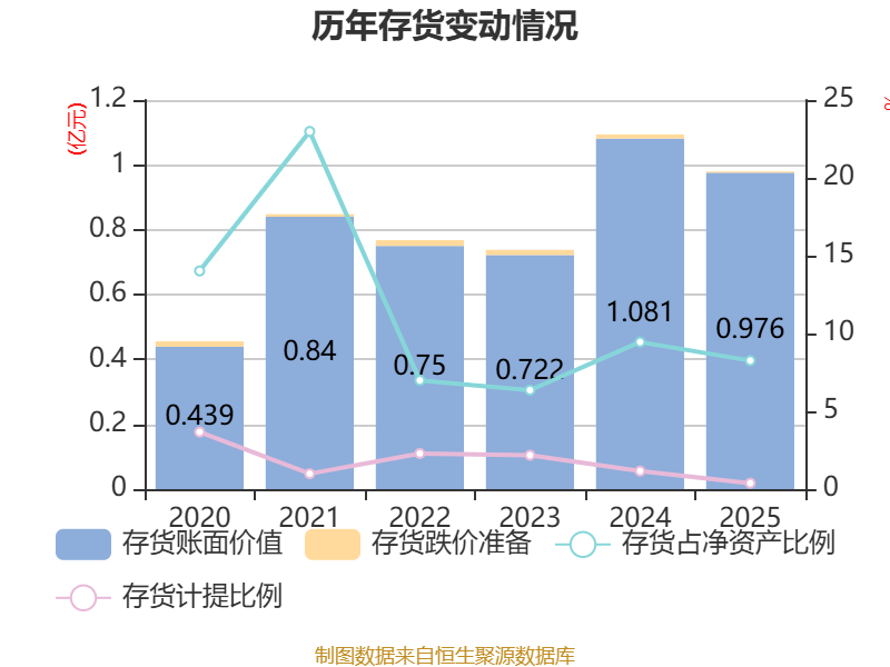 从存货变动来看,截至2025年末,公司存货账面价值为9762.44万元,占净资产的8.26%,较上年末减少1050万元。其中,存货跌价准备为36.8万元,计提比例为0.38%。