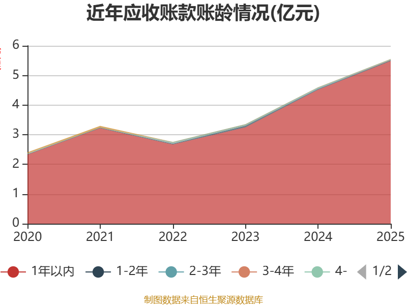 从应收账款账龄结构来看,截至2025年末,公司账龄在1年以内的应收账款余额为5.48亿元,较上年末增长9661.63万元,占应收账款总额比例为98.81%,较上年末上升0.49个百分点。