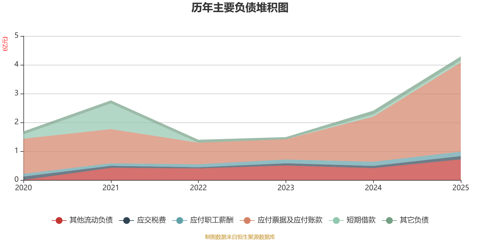 负债重大变化方面,截至2025年末,公司应付票据及应付账款较上年末增加98.21%,占公司总资产比重上升7.93个百分点;其他流动负债较上年末增加73.94%,占公司总资产比重上升1.47个百分点;应交税费较上年末增加47.88%,占公司总资产比重上升0.15个百分点;其他应付款(含利息和股利)较上年末减少12.15%,占公司总资产比重下降0.13个百分点。