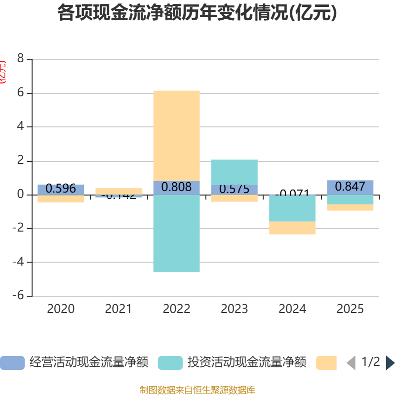 截至2025年,公司经营活动现金流净额为8465.88万元,同比增加9171.68万元;筹资活动现金流净额-3724.97万元,同比增加3813.21万元;投资活动现金流净额-5714.76万元,上年同期为-1.52亿元。