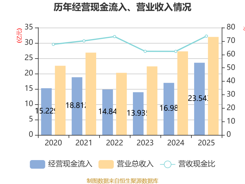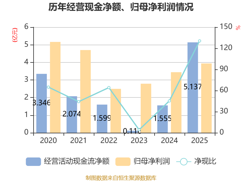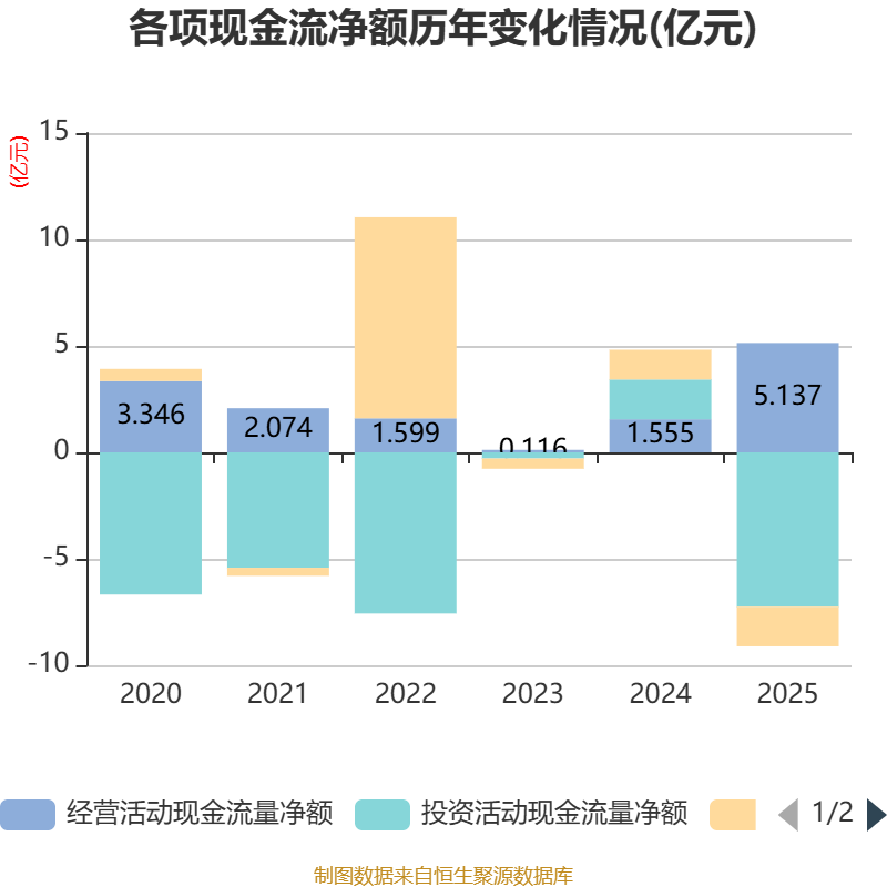 截至2025年,公司经营活动现金流净额为5.14亿元,同比增长230.34%;筹资活动现金流净额-1.86亿元,同比减少3.26亿元;投资活动现金流净额-7.25亿元,上年同期为1.87亿元。