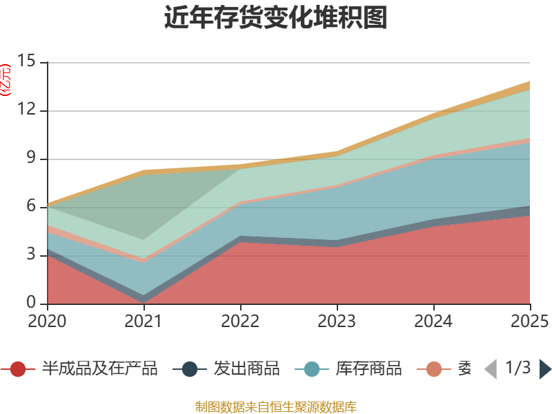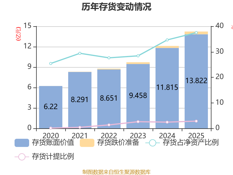 从存货变动来看,截至2025年末,公司存货账面价值为13.82亿元,占净资产的37.49%,较上年末增加2.01亿元。其中,存货跌价准备为4017.45万元,计提比例为2.82%。