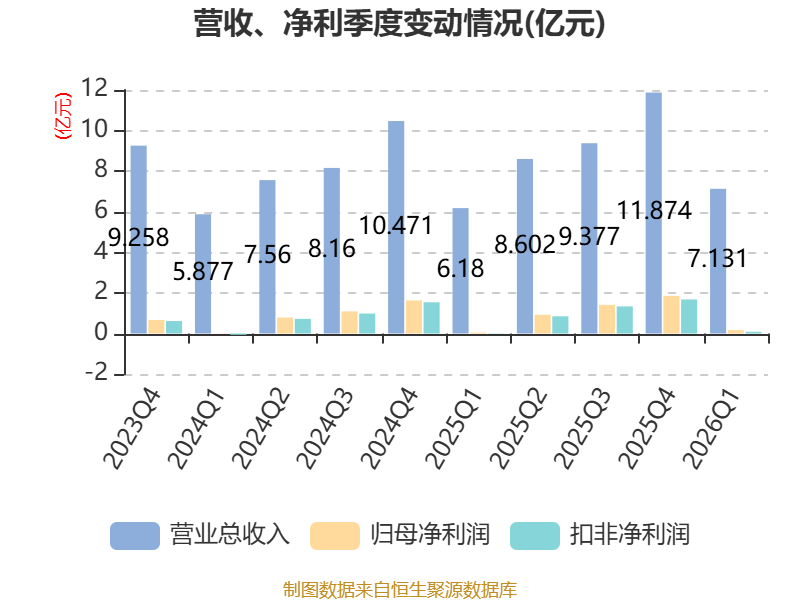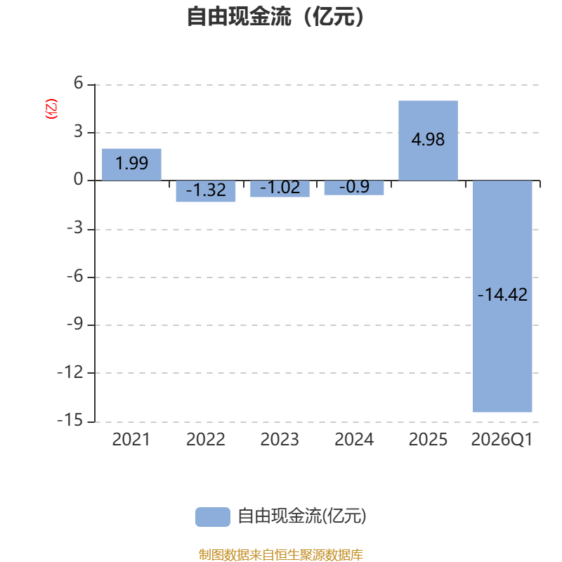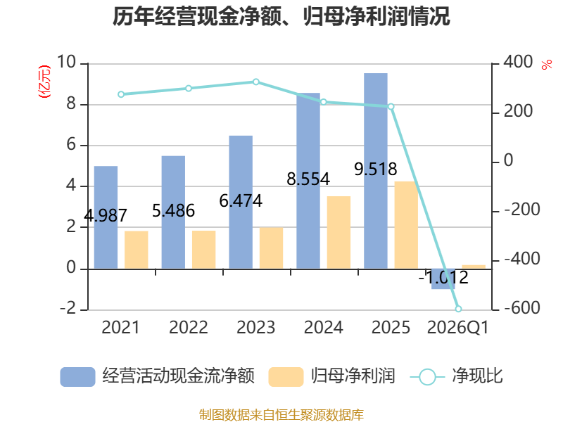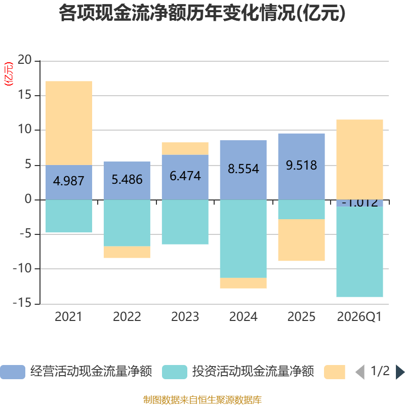 截至2026年一季度末,公司经营活动现金流净额为-1.01亿元,同比增加477.27万元;筹资活动现金流净额11.53亿元,同比增加12.53亿元;投资活动现金流净额-13.02亿元,上年同期为-3400.75万元。
