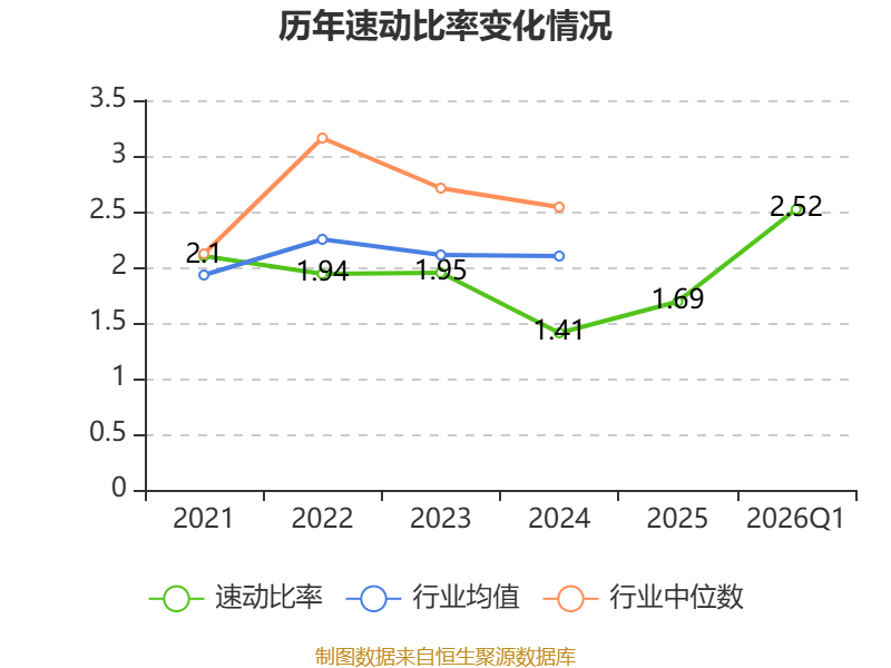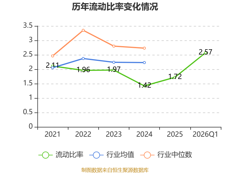 2026年第一季度,公司流动比率为2.57,速动比率为2.52。