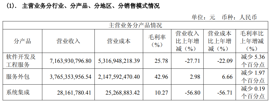 2025年年报显示,分产品看,作为营收主力的“软件开发及工程服务”板块2025年收入同比大幅下滑27.71%,是拖累公司整体业绩的重要因素。