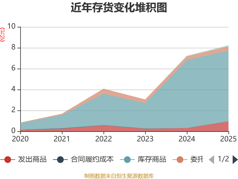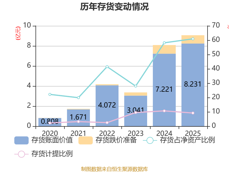 从存货变动来看,截至2025年末,公司存货账面价值为8.23亿元,占净资产的60.89%,较上年末增加1.01亿元。其中,存货跌价准备为8289.27万元,计提比例为9.15%。