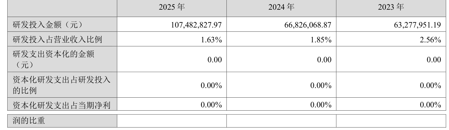 2025年全年,公司研发投入金额为1.07亿元,同比增长60.84%;研发投入占营业收入比例为1.63%,相比上年同期下降0.22个百分点。此外,公司全年研发投入资本化率为0%。