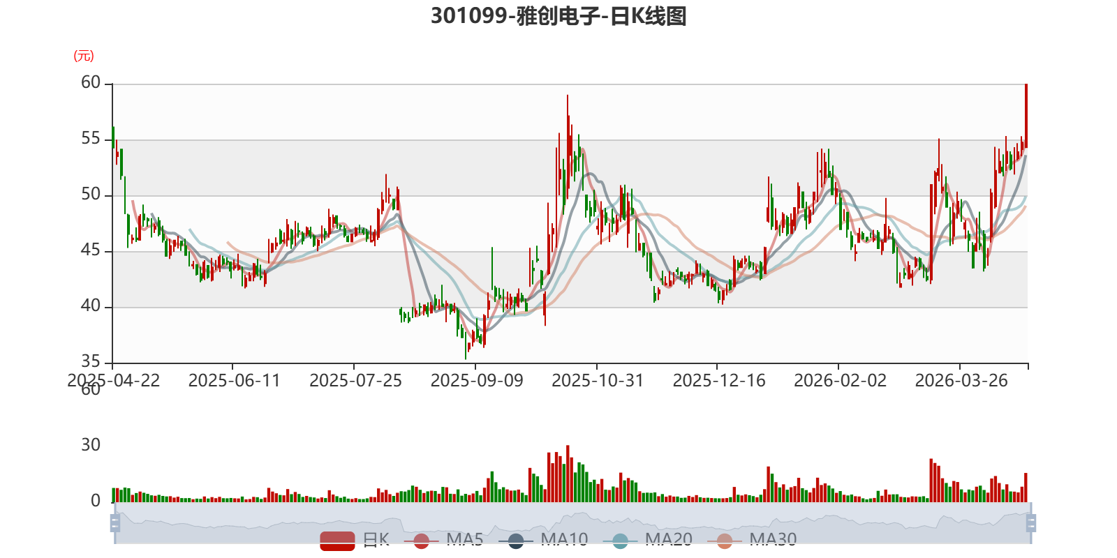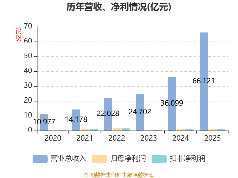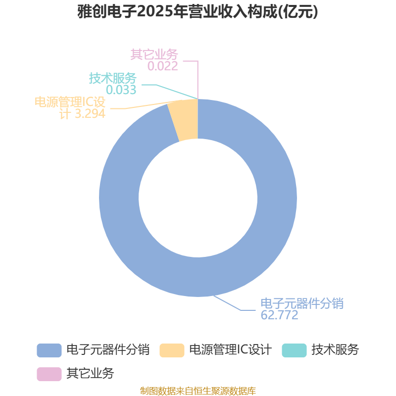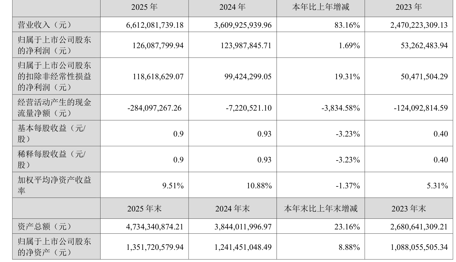 中证智能财讯雅创电子(301099)4月22日披露2025年年度报告。2025年,公司实现营业总收入66.12亿元,同比增长83.16%;归母净利润1.26亿元,同比增长1.69%;扣非净利润1.19亿元,同比增长19.31%;经营活动产生的现金流量净额为-2.84亿元,上年同期为-722.05万元;报告期内,雅创电子基本每股收益为0.9元,加权平均净资产收益率为9.51%。公司2025年度分配预案为:拟向全体股东每10股转3股,派现3元(含税)。