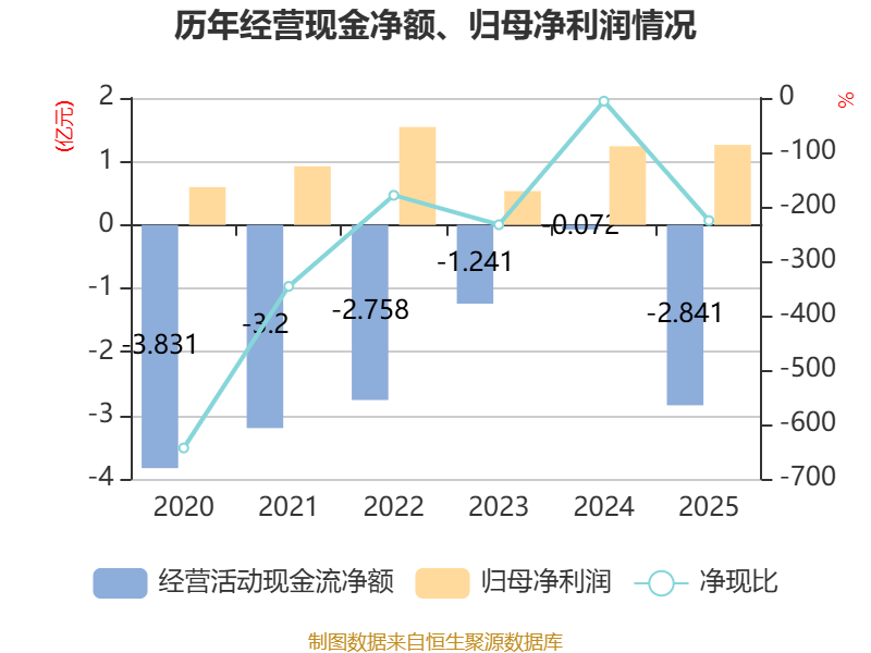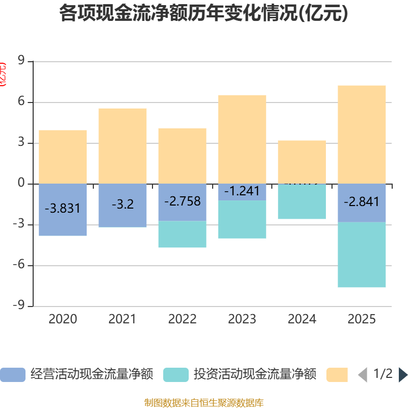 截至2025年,公司经营活动现金流净额为-2.84亿元,同比减少2.77亿元;筹资活动现金流净额7.21亿元,同比增加4.04亿元;投资活动现金流净额-4.79亿元,上年同期为-2.53亿元。