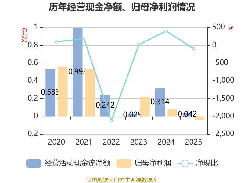 截至2025年,公司经营活动现金流净额为419.74万元,同比下降86.65%;筹资活动现金流净额-124.74万元,同比增加2.69亿元;投资活动现金流净额-4947.62万元,上年同期为-6133.29万元。