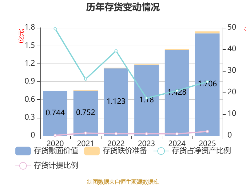 从存货变动来看,截至2025年末,公司存货账面价值为1.71亿元,占净资产的25.01%,较上年末增加2774.91万元。其中,存货跌价准备为340.88万元,计提比例为1.96%。