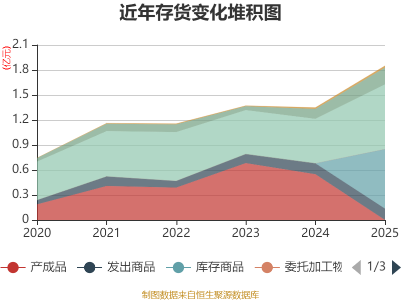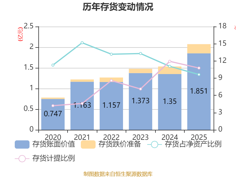 从存货变动来看,截至2025年末,公司存货账面价值为1.85亿元,占净资产的9.63%,较上年末增加5011.47万元。其中,存货跌价准备为2233.11万元,计提比例为10.77%。