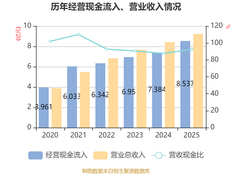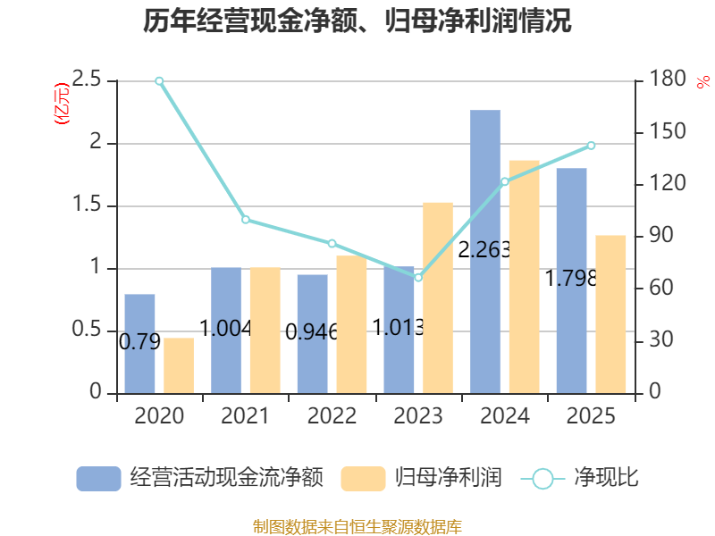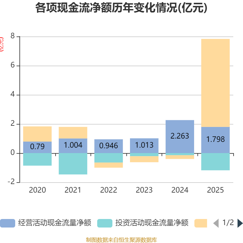截至2025年,公司经营活动现金流净额为1.8亿元,同比下降20.58%;筹资活动现金流净额6.03亿元,同比增加6.29亿元;投资活动现金流净额-1.18亿元,上年同期为-1439.36万元。