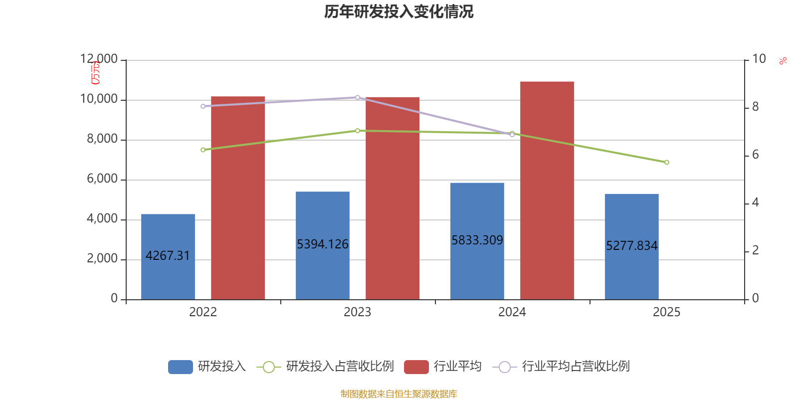 2025年全年,公司研发投入金额为5277.83万元,同比下降9.52%;研发投入占营业收入比例为5.72%,相比上年同期下降1.21个百分点。此外,公司全年研发投入资本化率为0%。
