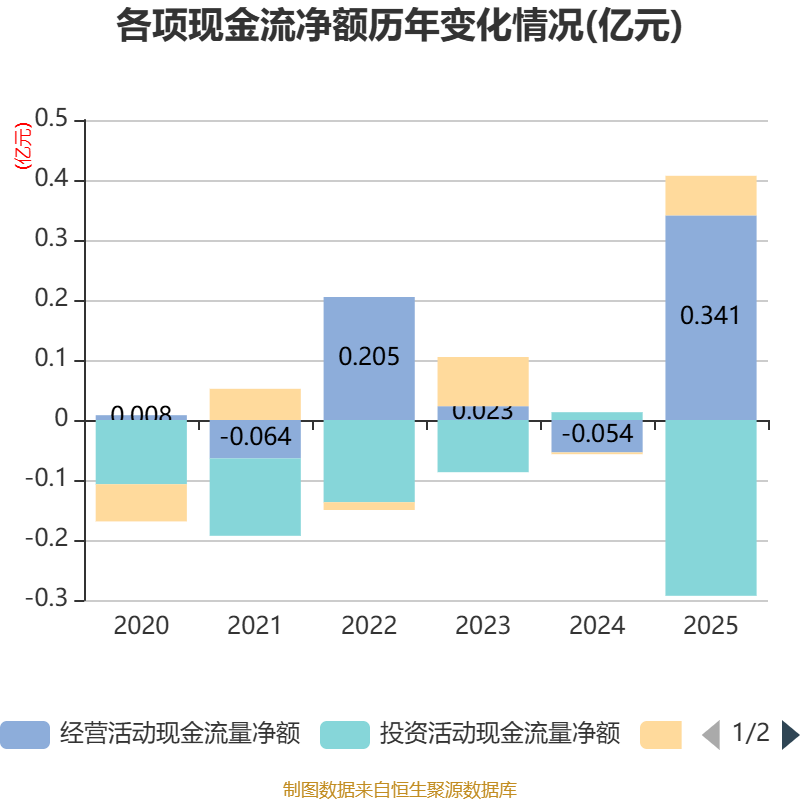 截至2025年,公司经营活动现金流净额为3412.8万元,同比增加3955.58万元;筹资活动现金流净额655.46万元,同比增加685.19万元;投资活动现金流净额-2929.09万元,上年同期为129.22万元。