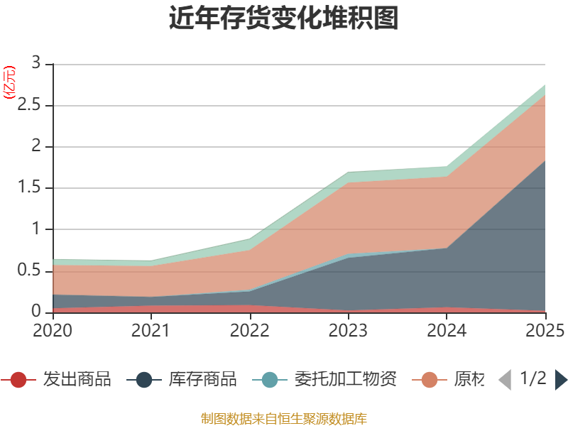 从存货变动来看,截至2025年末,公司存货账面价值为2.75亿元,占净资产的16.02%,较上年末增加9863.07万元。其中,存货跌价准备为2229.22万元,计提比例为7.5%。