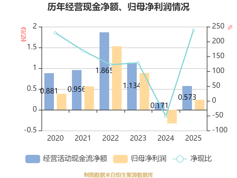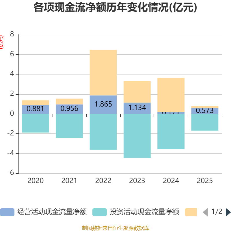 截至2025年,公司经营活动现金流净额为5727.19万元,同比增长235.65%;筹资活动现金流净额2166.36万元,同比减少3.25亿元;投资活动现金流净额-1.7亿元,上年同期为-3.56亿元。