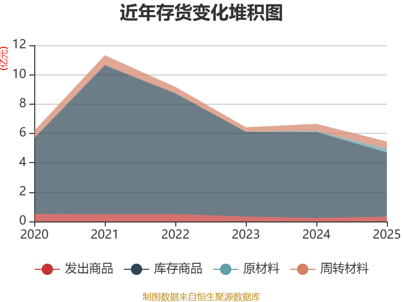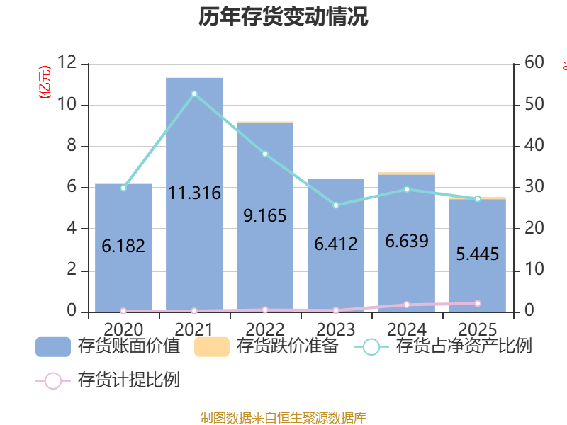 从存货变动来看,截至2025年末,公司存货账面价值为5.45亿元,占净资产的27.29%,较上年末减少1.19亿元。其中,存货跌价准备为1103.36万元,计提比例为1.99%。
