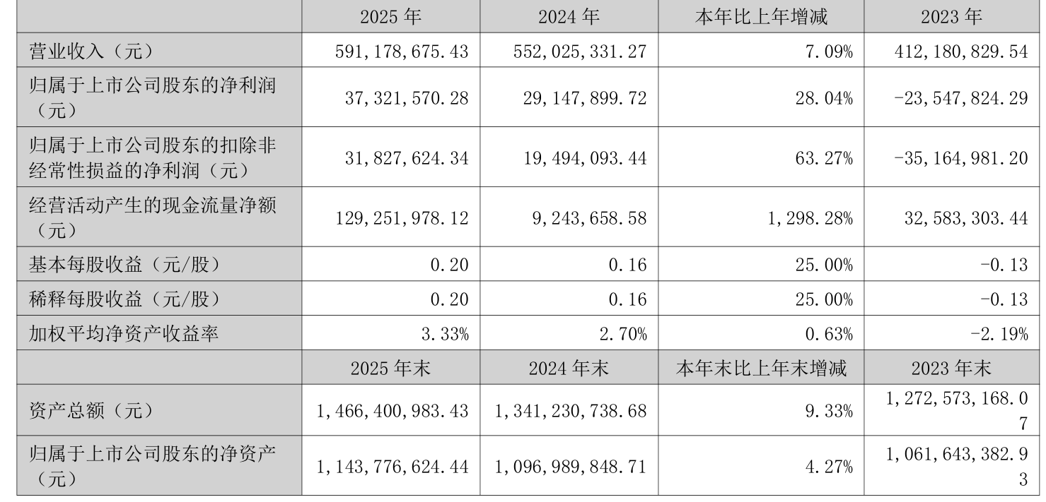 中证智能财讯雄帝科技(300546)4月22日披露2025年年度报告。2025年,公司实现营业总收入5.91亿元,同比增长7.09%;归母净利润3732.16万元,同比增长28.04%;扣非净利润3182.76万元,同比增长63.27%;经营活动产生的现金流量净额为1.29亿元,同比增长1298.28%;报告期内,雄帝科技基本每股收益为0.2元,加权平均净资产收益率为3.33%。公司2025年度分配预案为:拟向全体股东每10股派现0.45元(含税)。