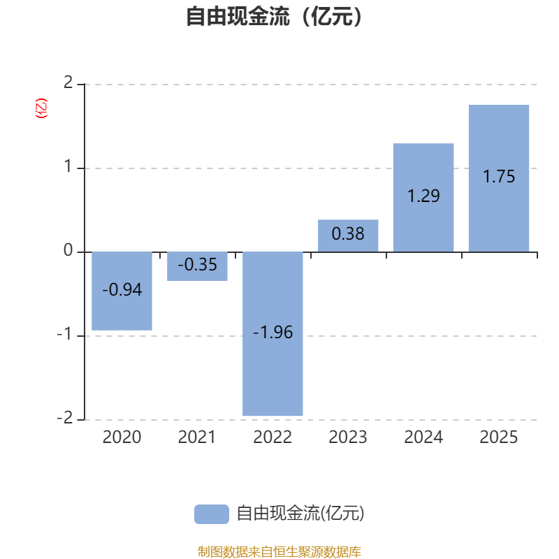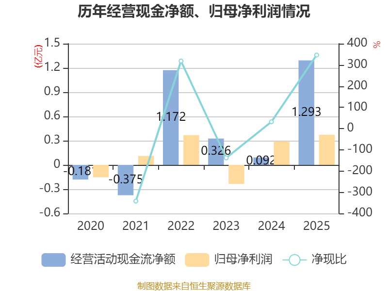 截至2025年,公司经营活动现金流净额为1.29亿元,同比增长1298.28%;筹资活动现金流净额470.23万元,同比增加379.99万元;投资活动现金流净额722.21万元,上年同期为1.13亿元。