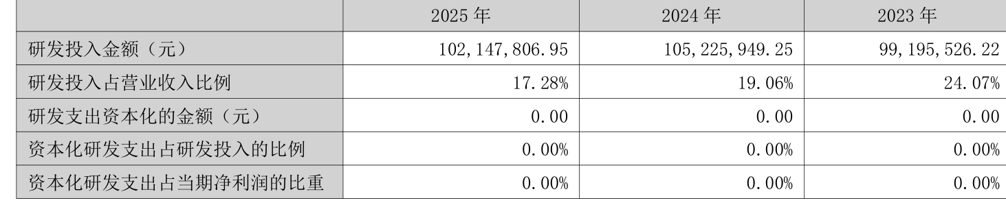 2025年全年,公司研发投入金额为1.02亿元,同比下降2.93%;研发投入占营业收入比例为17.28%,相比上年同期下降1.78个百分点。此外,公司全年研发投入资本化率为0%。
