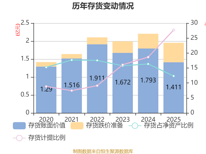 从存货变动来看,截至2025年末,公司存货账面价值为1.41亿元,占净资产的12.33%,较上年末减少3824.14万元。其中,存货跌价准备为5405.53万元,计提比例为27.7%。