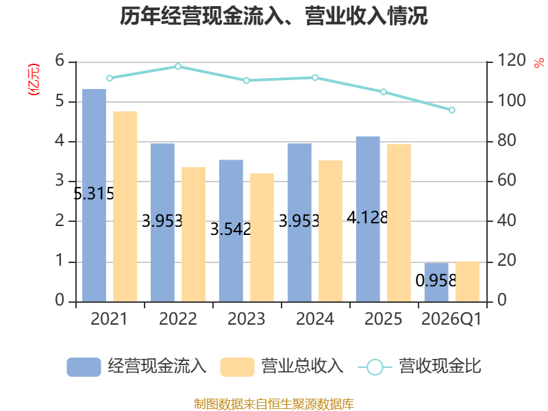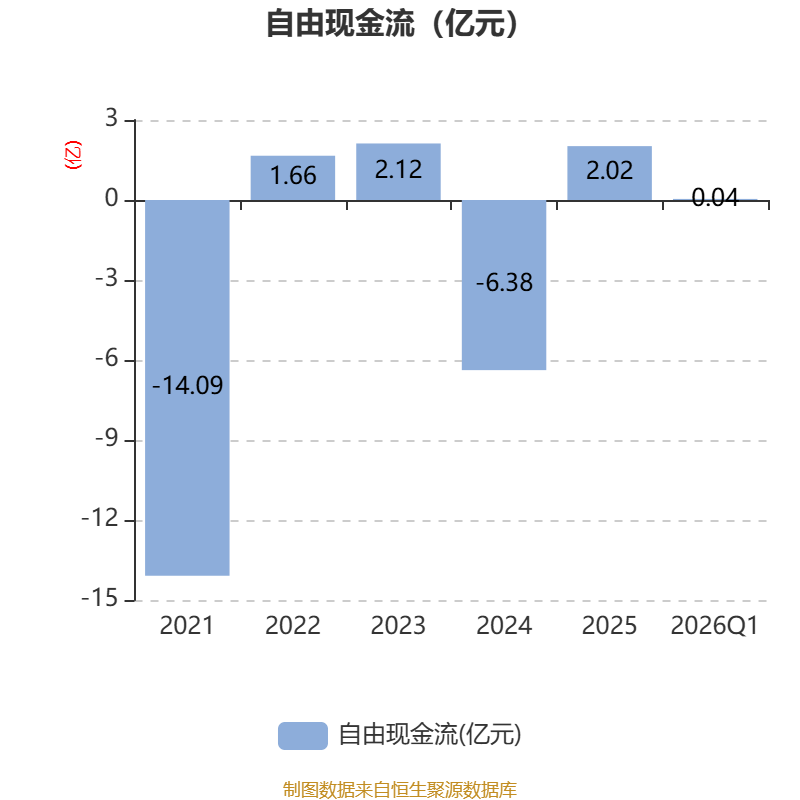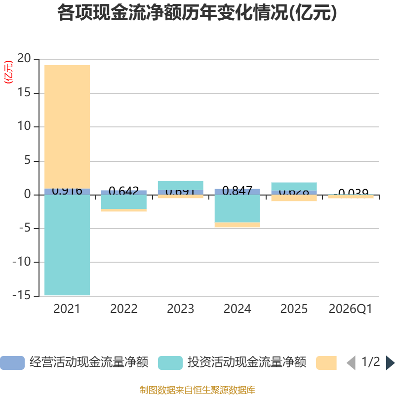 截至2026年一季度末,公司经营活动现金流净额为-385.27万元,同比增加183.6万元;筹资活动现金流净额-4923.21万元,同比减少4902.34万元;投资活动现金流净额665.51万元,上年同期为2145.72万元。