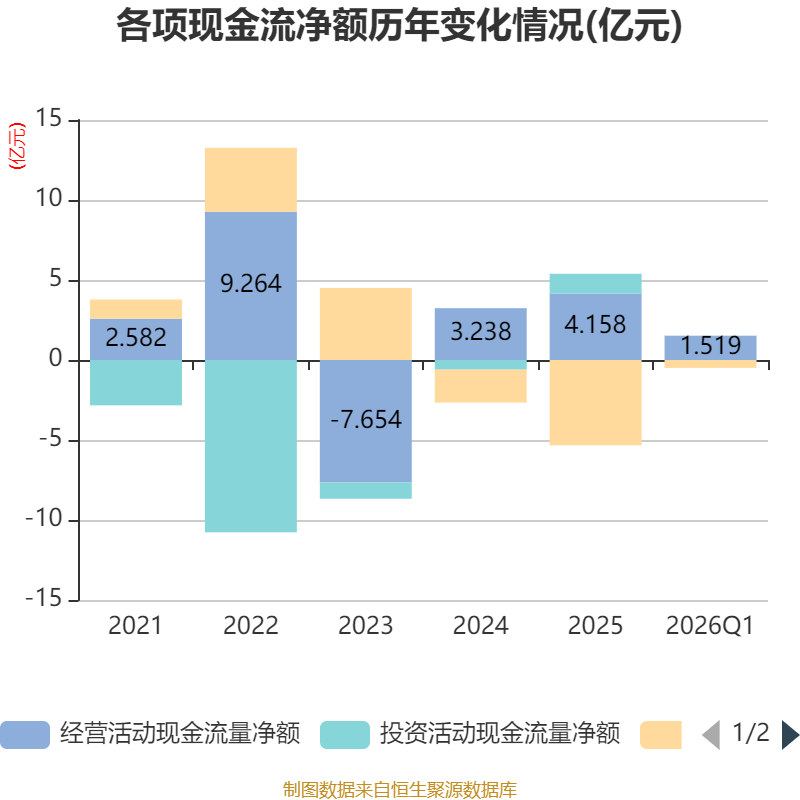 截至2026年一季度末,公司经营活动现金流净额为1.52亿元,同比增长31.22%;筹资活动现金流净额-4924.88万元,同比增加1.93亿元;投资活动现金流净额9060.26元,上年同期为-87.93万元。