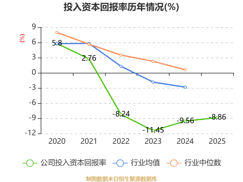 数据显示,2025年公司加权平均净资产收益率为-8.26%,较上年同期上升0.24个百分点。公司2025年投入资本回报率为-8.86%,较上年同期上升0.7个百分点。