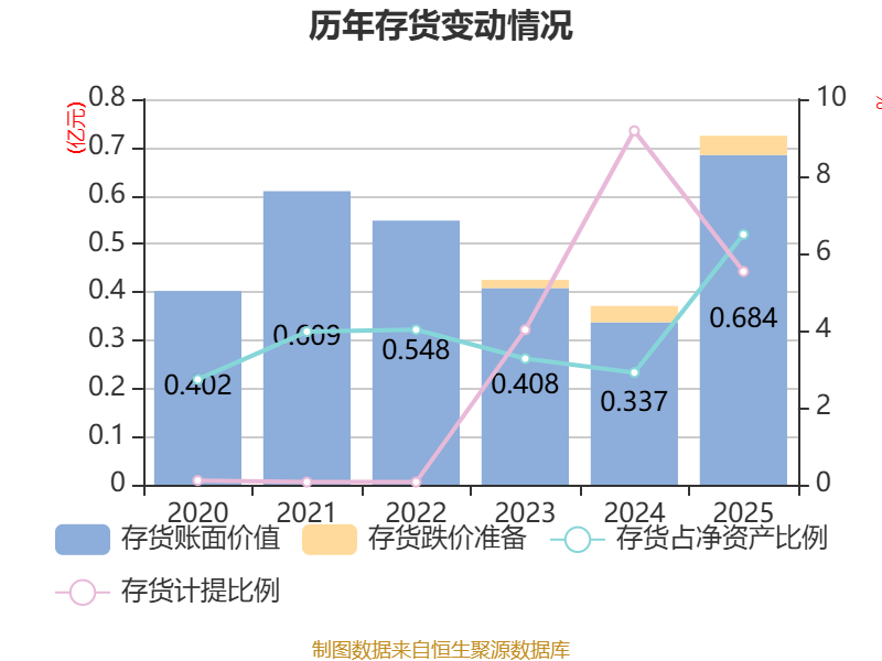 从存货变动来看,截至2025年末,公司存货账面价值为6842.58万元,占净资产的6.49%,较上年末增加3474.7万元。其中,存货跌价准备为400.91万元,计提比例为5.53%。