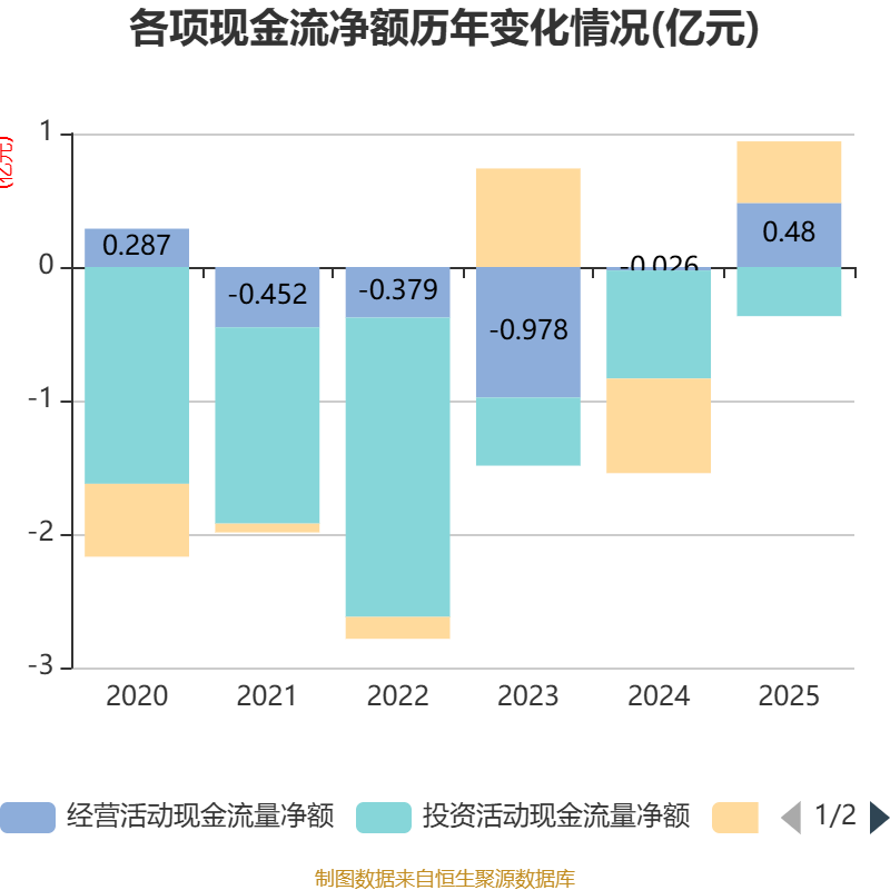 截至2025年,公司经营活动现金流净额为4797.7万元,同比增加5062.56万元;筹资活动现金流净额4609.02万元,同比增加1.17亿元;投资活动现金流净额-3683.95万元,上年同期为-8104.42万元。