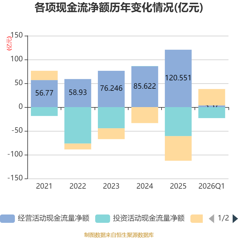 截至2026年一季度末,公司经营活动现金流净额为3.57亿元,同比下降82.22%;筹资活动现金流净额34.44亿元,同比增加25.88亿元;投资活动现金流净额-23.11亿元,上年同期为-12.1亿元。