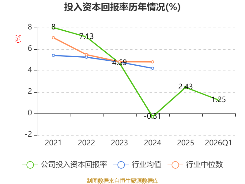 盈利能力方面, 2026年一季度公司加权平均净资产收益率为2.28%,同比上升1.21个百分点。公司2026年第一季度投入资本回报率为1.25%,较上年同期上升0.49个百分点。