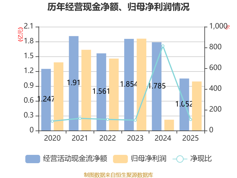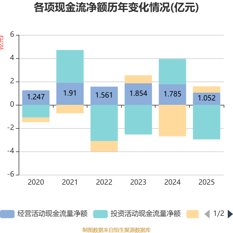 截至2025年,公司经营活动现金流净额为1.05亿元,同比下降41.09%;筹资活动现金流净额5374.31万元,同比增加3.24亿元;投资活动现金流净额-2.97亿元,上年同期为2.15亿元。