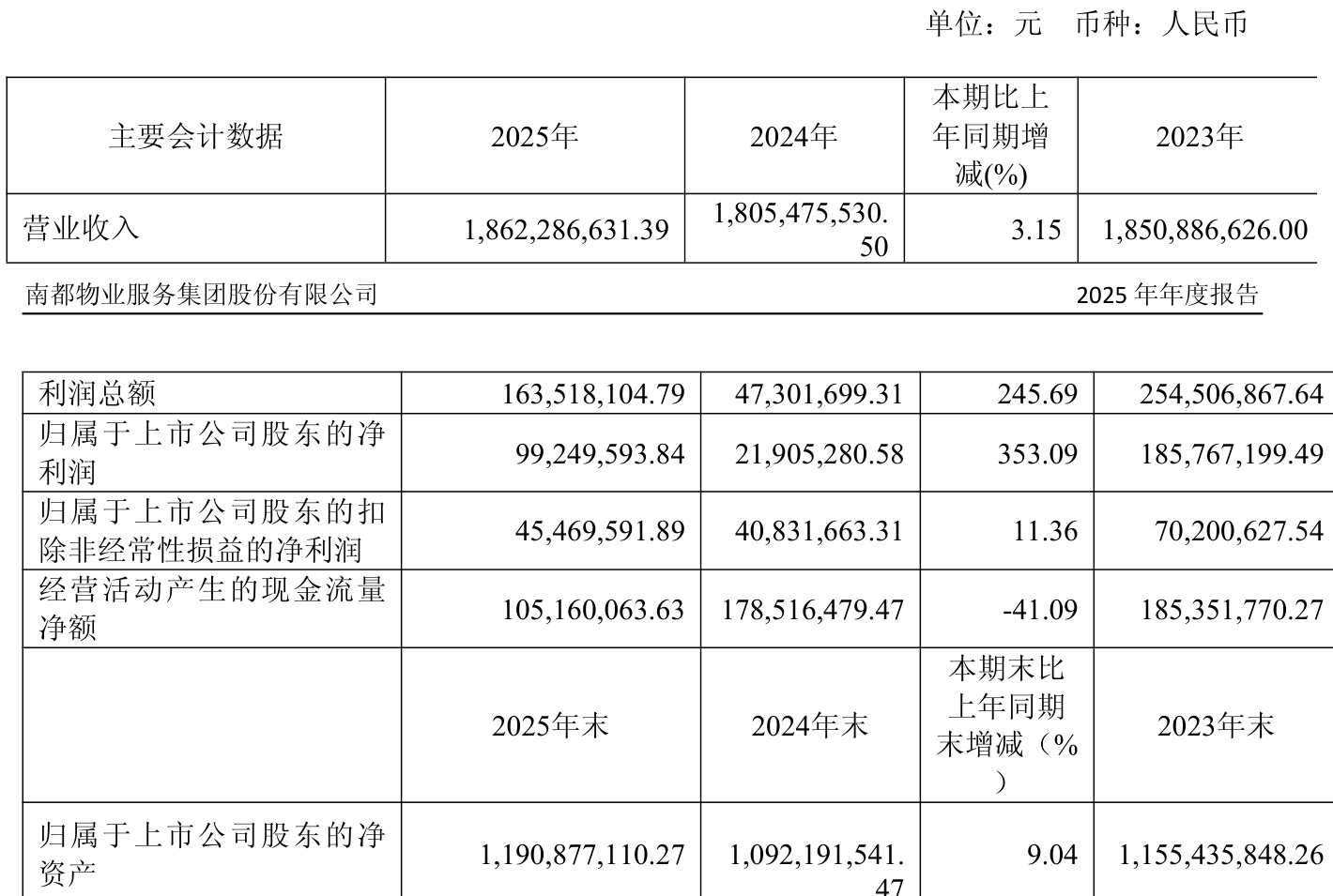 中证智能财讯南都物业(603506)4月22日披露2025年年度报告。2025年,公司实现营业总收入18.62亿元,同比增长3.15%;归母净利润9924.96万元,同比增长353.09%;扣非净利润4546.96万元,同比增长11.36%;经营活动产生的现金流量净额为1.05亿元,同比下降41.09%;报告期内,南都物业基本每股收益为0.54元,加权平均净资产收益率为8.69%。公司2025年度分配预案为:拟向全体股东每10股派现2.141元(含税)。