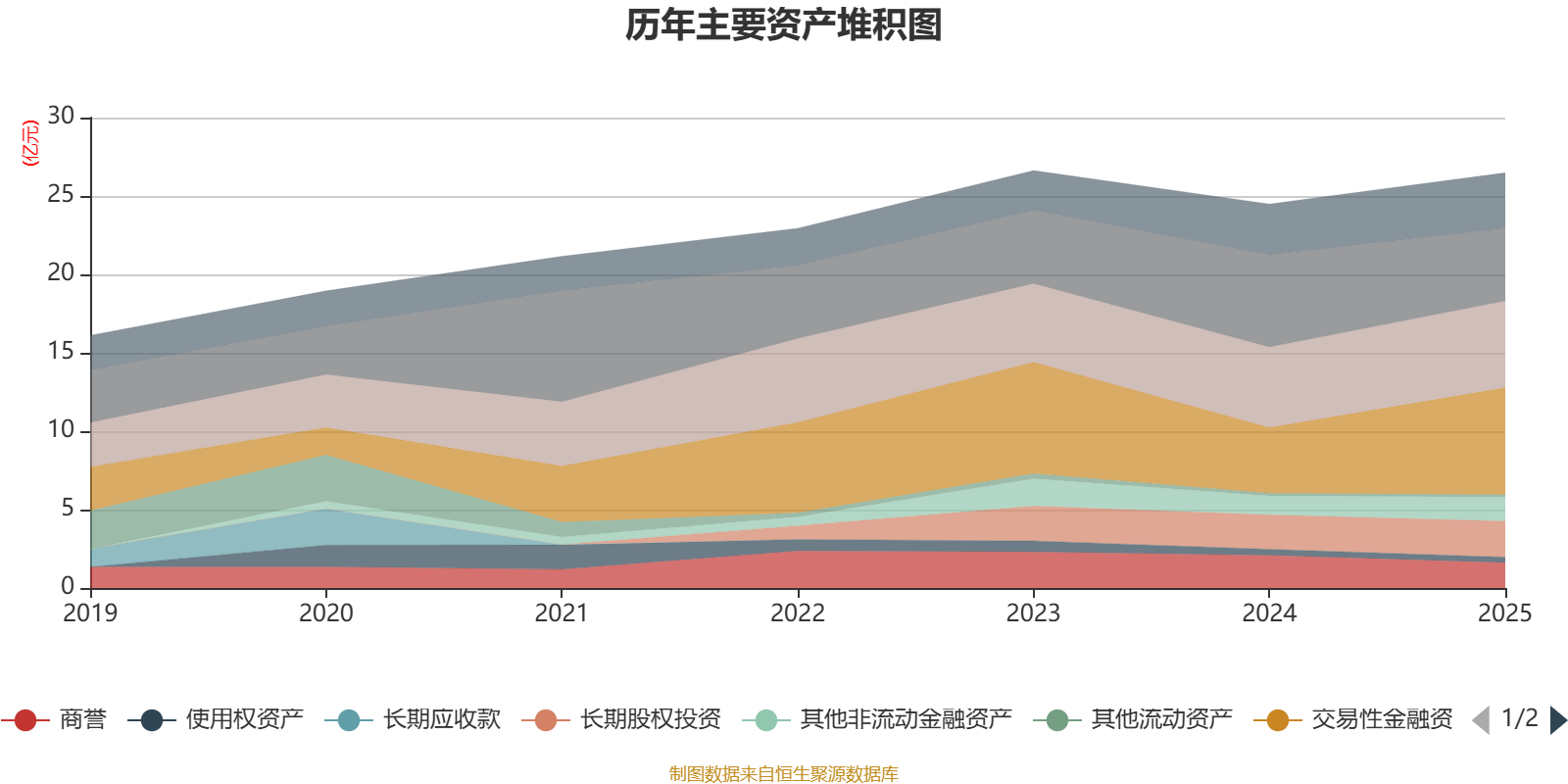 资产重大变化方面,截至2025年末,公司交易性金融资产合计较上年末增加63.43%,占公司总资产比重上升8.72个百分点;货币资金较上年末减少21.35%,占公司总资产比重下降6.55个百分点;商誉较上年末减少22.44%,占公司总资产比重下降2.41个百分点;其他非流动金融资产较上年末增加27%,占公司总资产比重上升0.86个百分点。