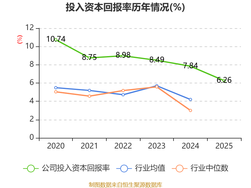 数据显示,2025年公司加权平均净资产收益率为7.86%,较上年同期下降2.99个百分点。公司2025年投入资本回报率为6.26%,较上年同期下降1.58个百分点。