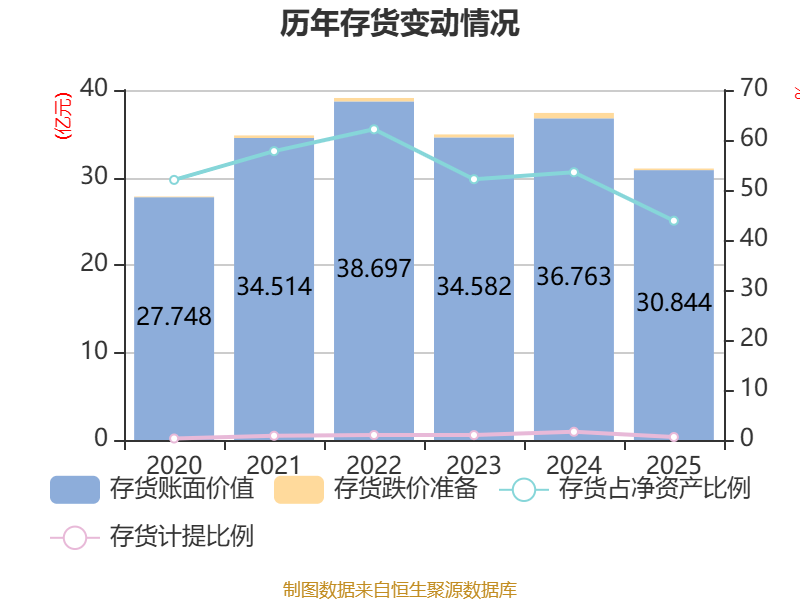 从存货变动来看,截至2025年末,公司存货账面价值为30.84亿元,占净资产的43.86%,较上年末减少5.92亿元。其中,存货跌价准备为1824.18万元,计提比例为0.59%。