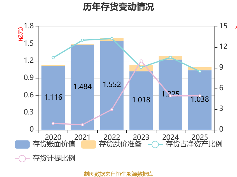 从存货变动来看,截至2025年末,公司存货账面价值为1.04亿元,占净资产的8.49%,较上年末减少1867.74万元。其中,存货跌价准备为538.31万元,计提比例为4.93%。