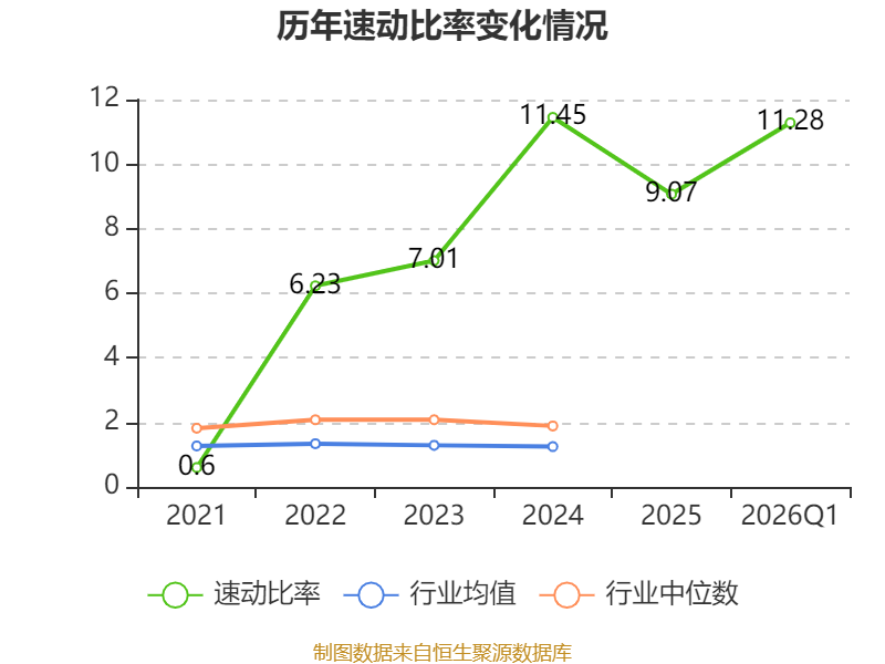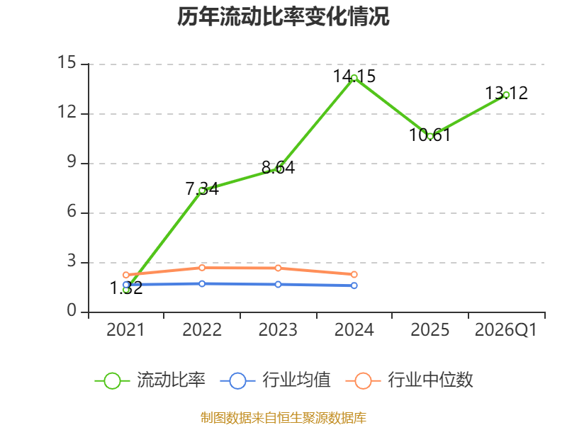 2026年第一季度,公司流动比率为13.12,速动比率为11.28。