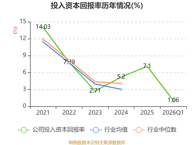 盈利能力方面, 2026年一季度公司加权平均净资产收益率为1.11%,同比下降0.37个百分点。公司2026年第一季度投入资本回报率为1.06%,较上年同期下降0.4个百分点。